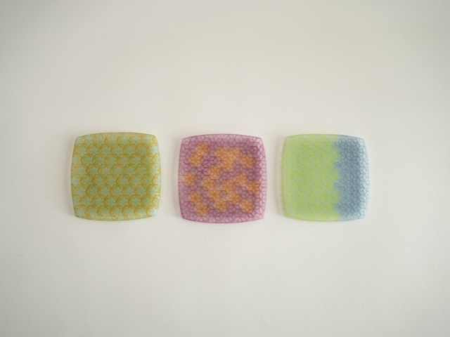 ガラス作家、林あゆみさんの作品です。 サイズ:幅80mm、奥行80mm、高さ6mm ※それぞれ若干サイズが異なります。 品番:3-24 (※写真をクリックすると拡大します。) 1.グリーン&ブルー 2.ピンク&オレンジ 3.グリーン&イエロー